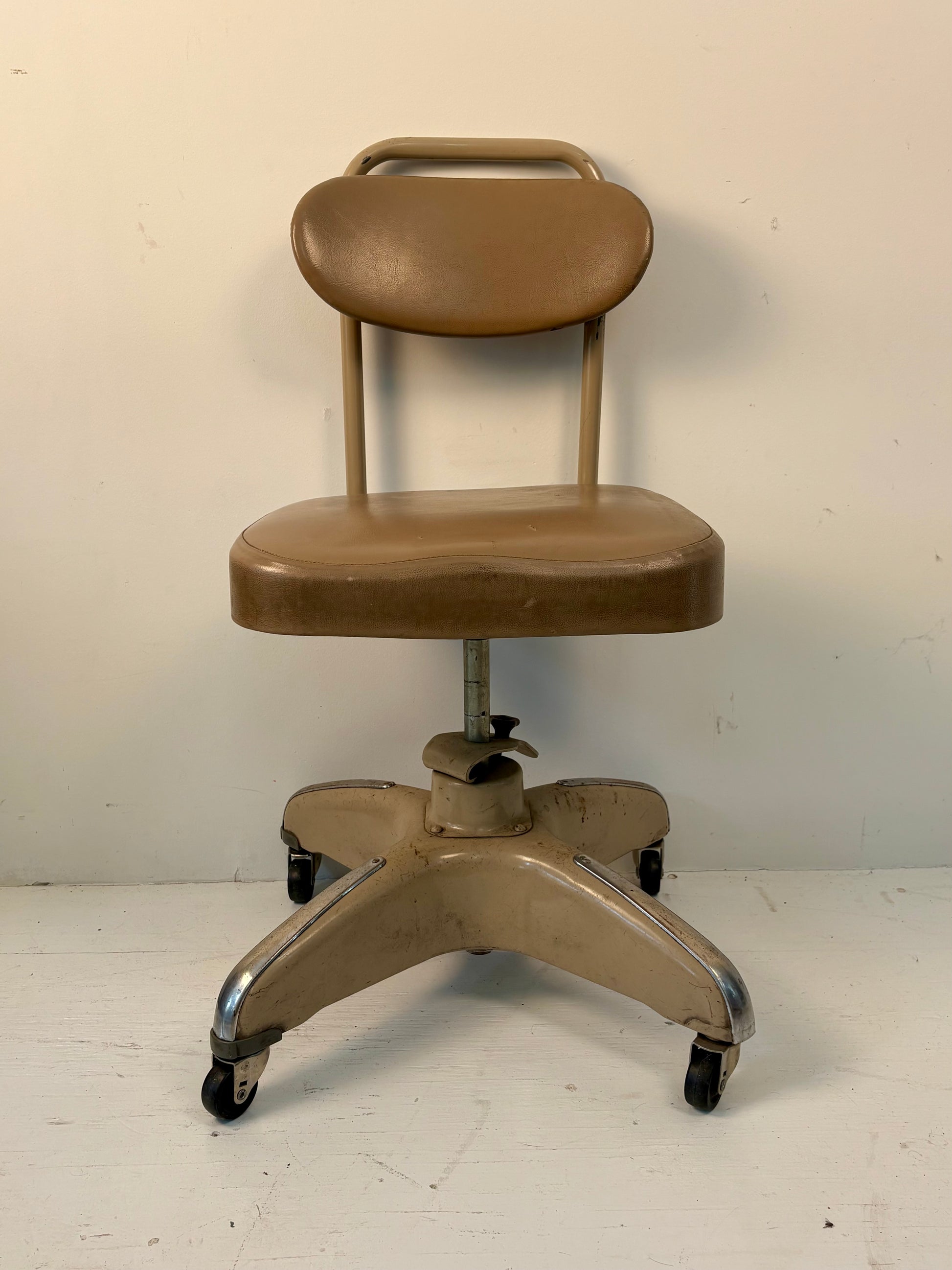 Mid-century industrial desk chairs don't get much better than this. This Cosco 15S was made in Gallatin, TN, in the 1950s and was built like a tank. It's full of character and patina, with an adjustable, spring-loaded backrest, original wheels, and "propeller" steel base with chrome accents.